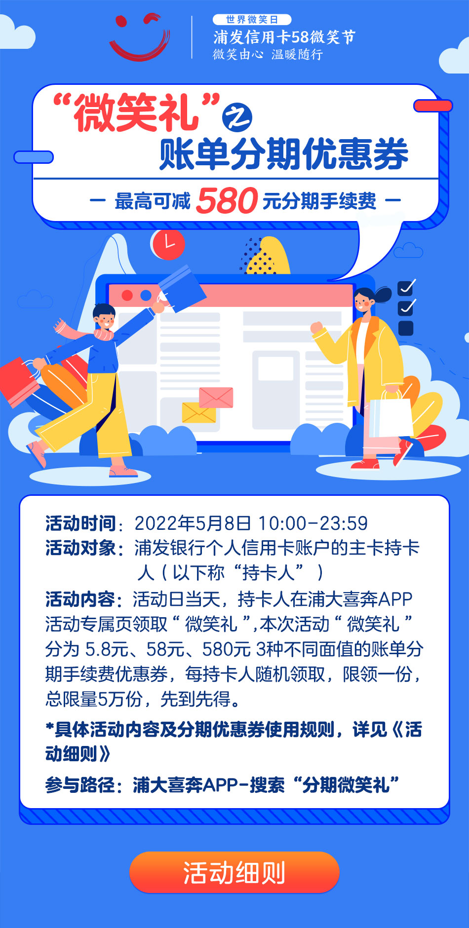 活动日当天,持卡人在浦大喜奔APP 活动专属页领取“微笑礼”,本次活动“微笑礼”分为 5.8元、58元、580元 3种不同面值的账单分期手续费优惠券,每持卡人随机领取,限领一份,总限量5万份,先到先得。