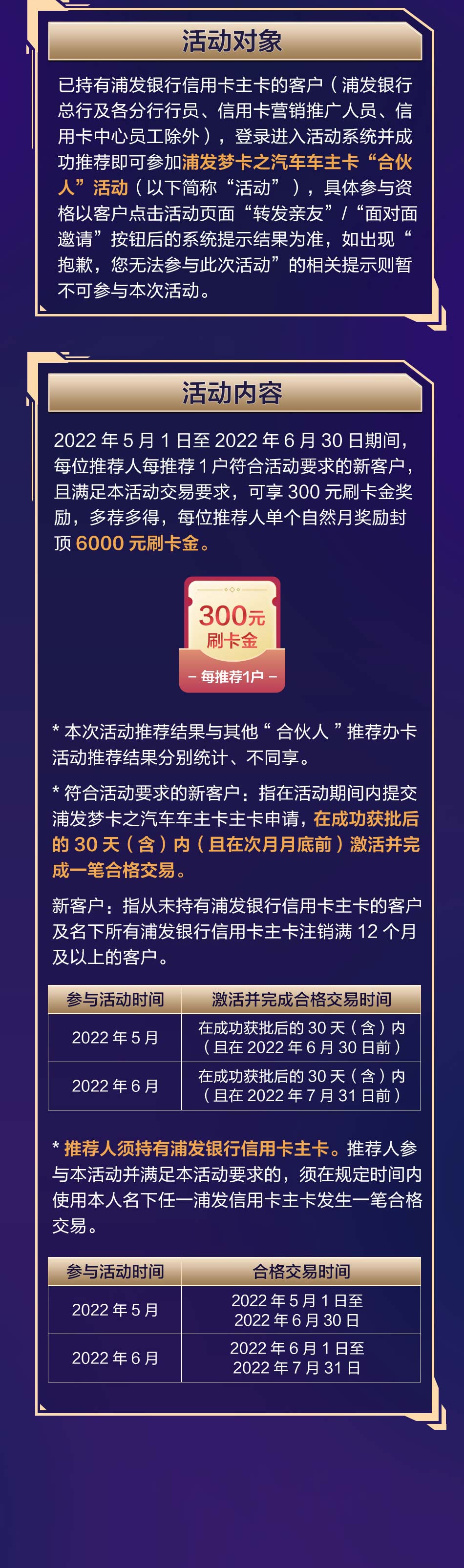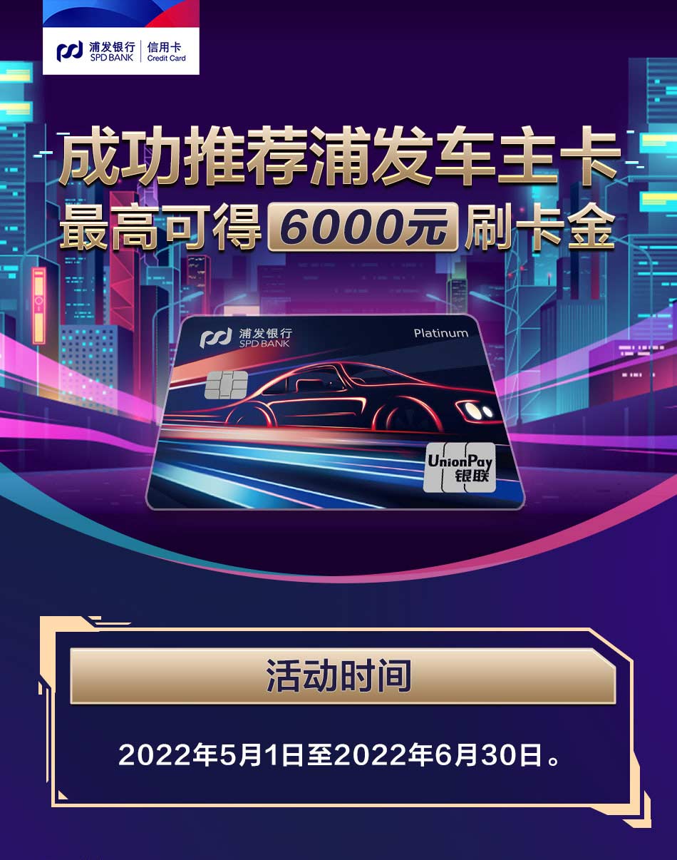 *符合活动要求的新客户:指在活动期间内提交浦发梦卡之汽车车主卡主卡申请,在成功获批后的30天(含)内(且在次月月底前)激活并完成一笔合格交易,其中2022年5月提交浦发信用卡主卡申请,在成功获批后的30天(含)内(且在2022年6月30日前)激活并完成一笔合格交易;2022年6月提交浦发信用卡主卡申请,在成功获批后的30天(含)内(且在2022年7月31日前)激活并完成一笔合格交易。