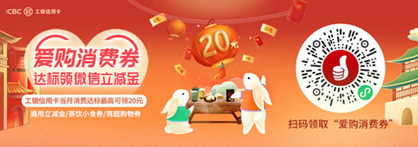 2. 活动期间,持卡人使用工银信用卡当月单笔达标消费笔数2笔,有机会领取一张满10元立减5元通用微信立减金;当月单笔达标消费笔数累计消费5笔,有机会领取一张茶饮类满20元立减5元场景消费券;当月单笔达标消费笔数累计消费8笔,有机会领取一张商超类满30元立减10元场景消费券。每位持卡人每种场景消费券限领取一张,每月最多领取共计20元爱购消费券。名额有限,先到先得。