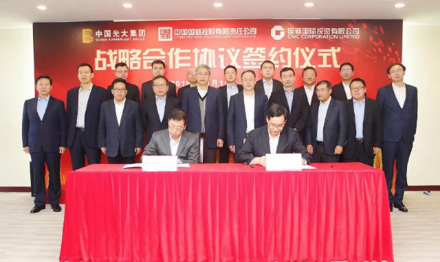 10月19日,中国光大集团与中国国新控股有限责任公司(简称“中国国新”)、国新国际投资有限公司(简称“国新国际”)在光大中心签署战略合作协议。