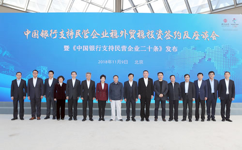 11月9日,中国银行发布《支持民营企业二十条》,并在总行主会场及9个分会场与超百家民营企业签署《总对总合作协议》,随后召开支持民营企业稳外贸稳投资座谈会。商务部、中国人民银行、全国工商联相关领导,中国银行董事长陈四清、行长刘连舸、副行长林景臻、首席风险官潘岳汉等出席。