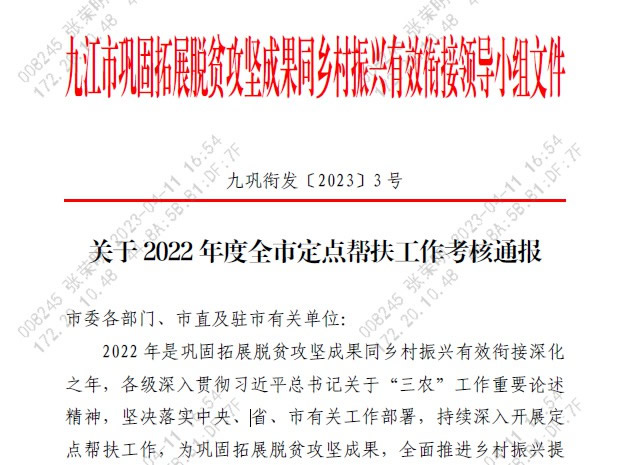 近日,九江市巩固拓展脱贫攻坚成果同乡村振兴有效衔接领导小组下发《关于2022年度全市定点帮扶工作考核通报》(九巩衔发〔2023〕3号)文件,对2022年度全市定点帮扶成绩突出的单位及个人进行通报表扬,九江银行获评“2022年度全市定点帮扶先进单位”,九江银行驻村第一书记朱龙荣获“先进个人”荣誉称号。