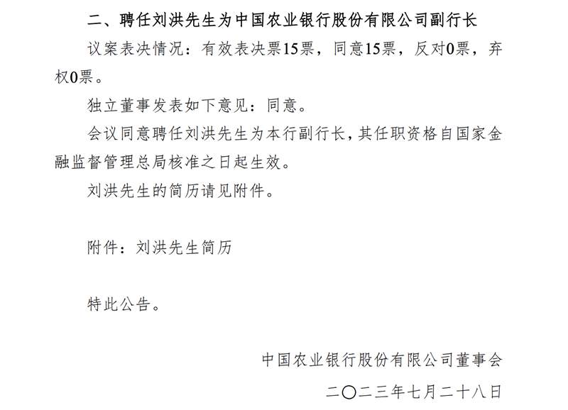 7月29日,中国农业银行发布公告称,该行董事会于7月28日在北京以现场方式召开会议,同意聘任刘洪为农业银行副行长,其任职资格自国家金融监督管理总局核准之日起生效。