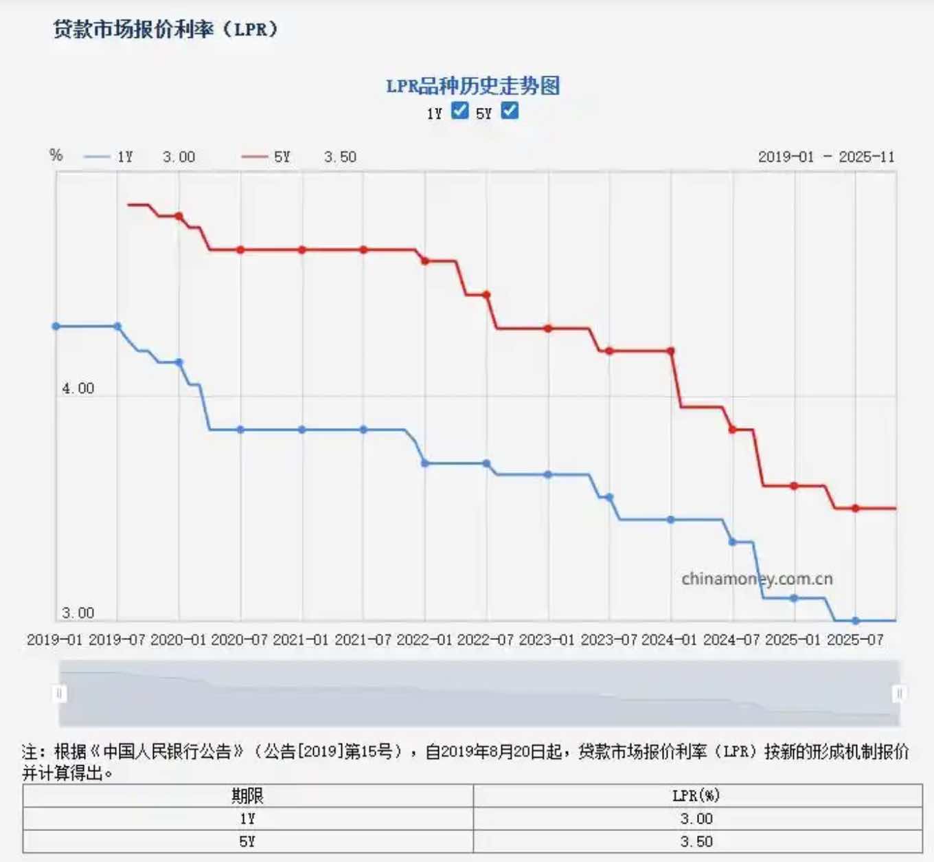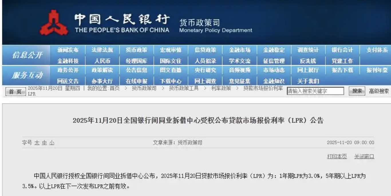 20日9时,中国人民银行授权全国银行间同业拆借中心公布,2025年11月20日贷款市场报价利率(LPR)为:1年期LPR为3.0%,5年期以上LPR为3.5%。以上LPR在下一次发布LPR之前有效。