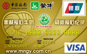 中国银行携手内蒙古蒙牛乳业(集团)股份有限公司推出中国银行首张慈善公益卡——中银蒙牛爱心信用卡。中银蒙牛爱心信用卡不仅是一张标准的中银信用卡,具备中国银行为您提供的众多基本功能与服务,更为充满爱心的您提供了展示关爱的良好平台,让您在享受无限信用的同时,也为中国的慈善事业贡献一份力量!