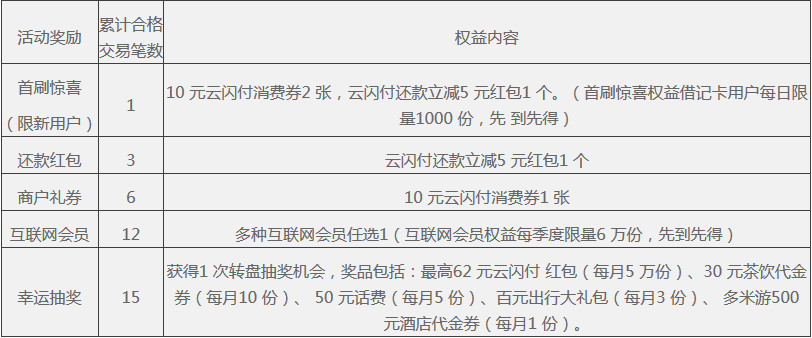1.用户成功报名后应以绑定无界卡进行消费,累计合格交易达15笔即可领取【幸运抽奖】权益,用户可参与1次转盘抽奖。奖品包括最高62元云闪付红包(每月5万份)、30元茶饮代金券(每月10份)、50元话费充值(每月5份)、百元出行大礼包(每月3份)、多米游500元酒店代金券(每月1份)。