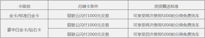 *各卡级别洗车权益达标门槛条件及获赠积分兑换免费洗车资质数如下表:
