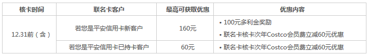 2019年12月31日前(含),成功申请并核发平安银行Costco联名卡,最高可享160元奖励优惠: