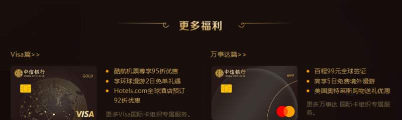 中信银行万事达单币标准金卡:出境人士优选信用卡!有效期内免年费、免除1.5%货币转换费、环球赏,最高享30%返现、5000元盗刷保障险