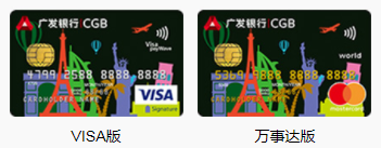 尊享MasterCard World卡、VISA Signature卡级别,享受境外卡组织高端权益,敢出发,享不同!礼遇优惠详询MasterCard、VISA官方网站。