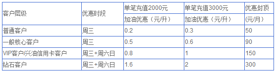 (2)“兴油卡持卡加油特惠日”活动的优惠幅度根据当期发改委公布的零售最高限价计算,如加油站同时开展挂牌优惠等加油优惠,优惠金额不叠加,由系统按客户可获得的最高档优惠幅度进行清算。例如:在中石化油站挂牌0.6元/升优惠的情况下,如客户为我行VIP客户,且满足单笔充值3000元加油优惠条件,则周三按照最高1元/升优惠享受,清算方式是油站挂牌直接已减免0.6元/升的优惠下,再返还0.4元/升优惠给客户的油卡账户内。